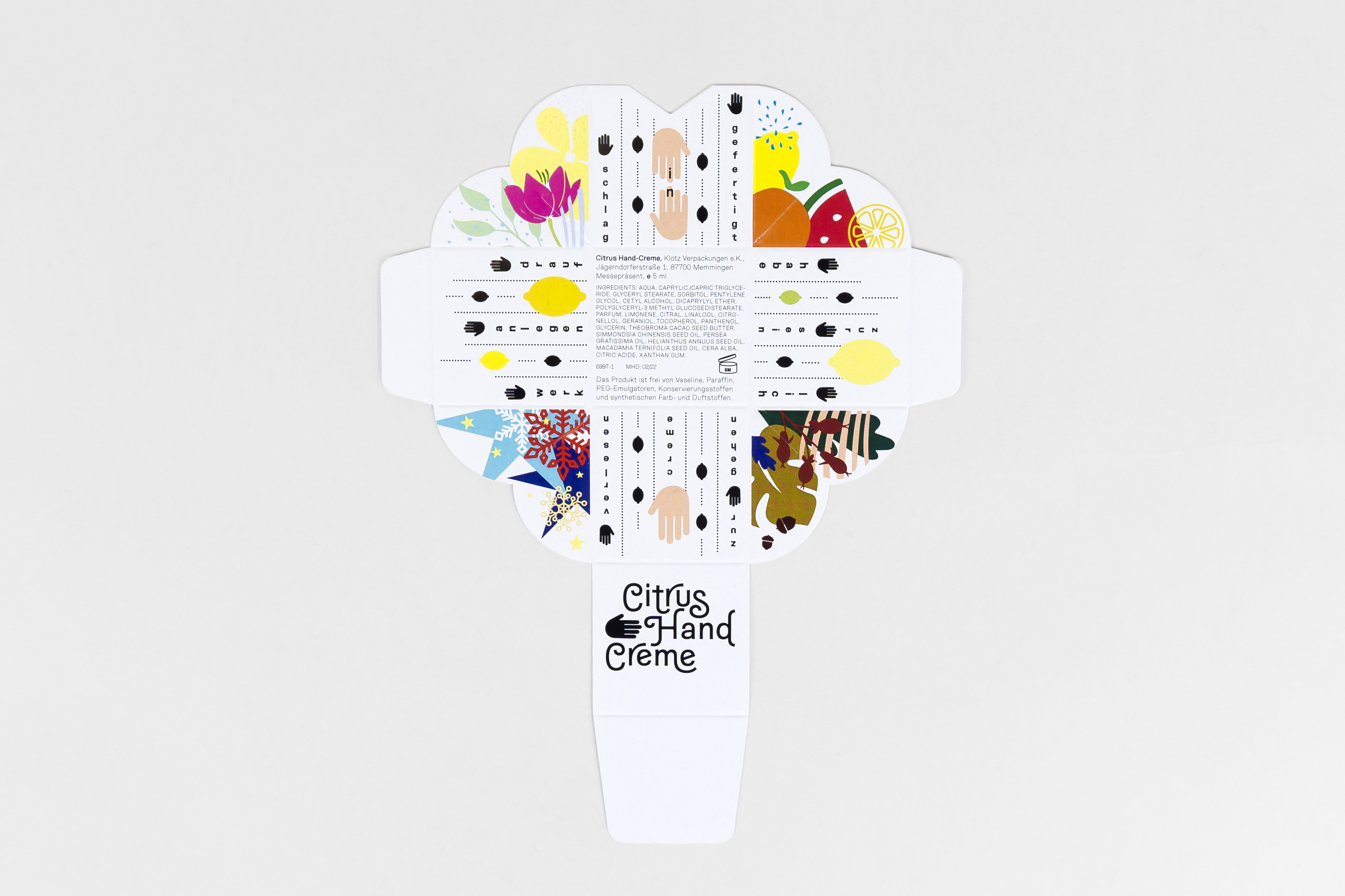 Diese Mini-Faltschachtel aus 280 g/qm-Chromokarton im geschlossenen quadratischen Format 38 × 38 mm wurde hergestellt, um eine kleine Portion Handcreme ansprechend zu beherbergen. Dieses 4-farbige Druckprodukt wurde nach dem Druck auf die entsprechenden Maße gestanzt, gerillt und erst beim Kunden zusammen mit der Creme aufgestellt bzw. konfektioniert.